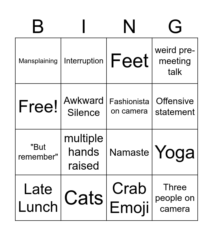 This bingo card has 16 words: Cats, Yoga, Feet, Mansplaining, "But remember", Interruption, Namaste, Crab Emoji, Free!, Awkward Silence, Late Lunch, weird pre-meeting talk, multiple hands raised, Offensive statement, Fashionista on camera and Three people on camera.