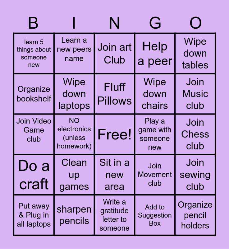 This bingo card has a free space and 24 words: Clean up games, sharpen pencils, Fluff Pillows, Put away & Plug in all laptops, Wipe down tables, learn 5 things about someone new, Organize bookshelf, Learn a new peers name, Play a game with someone new, Sit in a new area, Wipe down chairs, Join Video Game club, Join Movement club, Join sewing club, Wipe down laptops, Add to Suggestion Box, Join Chess club, Join art Club, Join Music club, NO electronics (unless homework), Organize pencil holders, Do a craft, Help a peer and Write a gratitude letter to someone.