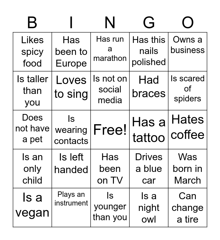 This bingo card has a free space and 24 words: Is left handed, Plays an instrument, Is not on social media, Is a vegan, Owns a business, Likes spicy food, Is taller than you, Has been to Europe, Has a tattoo, Has been on TV, Had braces, Does not have a pet, Drives a blue car, Was born in March, Loves to sing, Is a night owl, Hates coffee, Has run a marathon, Is scared of spiders, Is wearing contacts, Can change a tire, Is an only child, Has this nails polished and Is younger than you.
