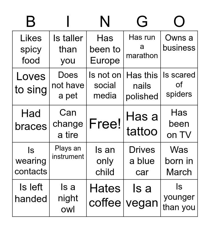 This bingo card has a free space and 24 words: Is left handed, Plays an instrument, Is not on social media, Is a vegan, Owns a business, Likes spicy food, Is taller than you, Has been to Europe, Has a tattoo, Has been on TV, Had braces, Does not have a pet, Drives a blue car, Was born in March, Loves to sing, Is a night owl, Hates coffee, Has run a marathon, Is scared of spiders, Is wearing contacts, Can change a tire, Is an only child, Has this nails polished and Is younger than you.