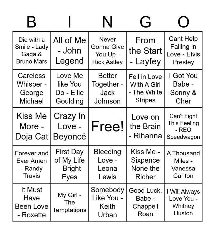 This bingo card has a free space and 67 words: (You Drive Me) Crazy -Brittney Spears, A Moment Like This - Kelly Clarkson, A Sky Full of Stars - Coldplay, A Thousand Miles - Vanessa Carlton, Achy Breaky Heart - Billy Ray Cyrus, Adore You - Harry Styles, All of Me - John Legend, All you Need is Love - The Beetles, Better Together - Jack Johnson, Birds of a Feather - Billie Eilish, Bleeding Love - Leona Lewis, Boom Clap - Charlie XCX, Can't Fight This Feeling - REO Speedwagon, Cant Help Falling in Love - Elvis Presley, Cant Take my Eyes off of You - Frankie Vallie, Careless Whisper - George Michael, Crazy In Love - Beyoncé, Die with a Smile - Lady Gaga & Bruno Mars, Every Time We Touch - Cascada, Fell in Love With A Girl - The White Stripes, First Day of My Life - Bright Eyes, Forever and Ever Amen - Randy Travis, From the Start - Layfey, Good Luck, Babe - Chappell Roan, Havent Met You Yet - Michael Buble, Hey There Deliah - Plain White Tees, How Do I Live - LeAnn Rimes, I Don’t Wanna Miss A Thing - Aerosmith, I Got You Babe - Sonny & Cher, I Want You to Want Me - Letters To Cleo, I Will Always Love You - Whitney Huston, I’m Gonna Be (500 Miles) - The Proclaimers, I'm Yours - Jason Maraz, I've Had the Time of My Life - Bill Medley & Jamie Warnes, Iris - The Goo Goo Dolls, It Must Have Been Love - Roxette, It’s Your Love - Tim McGraw, Kiss Me - Sixpence None the Richer, Kiss Me More - Doja Cat, L-O-V-E - Nat King Cole, Lips of An Angel - Hinder, Love Me like You Do - Ellie Goulding, Love on the Brain - Rihanna, Love on The Weekend - John Mayer, Love Story - Taylor Swift, Make You Feel My Love - Adel, Maps - The Yeah Yeah Yeah's, My Girl - The Temptations, My Heart Will Go On - Celine Dion, My Love Mine All Mine - Mitski, Never Gonna Give You Up - Rick Astley, Never, Never Gonna Give Ya Up - Barry White, No One - Alecia Keys, Only Wanna Be With You - Hootie and the Blowfish, Put Your Head On My Shoulder - Paul Anka, Somebody Like You - Keith Urban, Stereo Hearts - Gym Class Heroes, The Shoop Shop Song (It’s In His Kiss) - Cher, Thinking Out Loud - Ed Sheeran, This Kiss - Faith Hill, Unchained Melody - The Righteous Brothers, Waiting For A Girl Like You - Foreigner, What’s Love Got to Do with it? - Tina Turner, Wonderwall - Oasis, You're Beautiful - James Blunt, You're The Inspiration - Chicago and Your Song - Elton John.