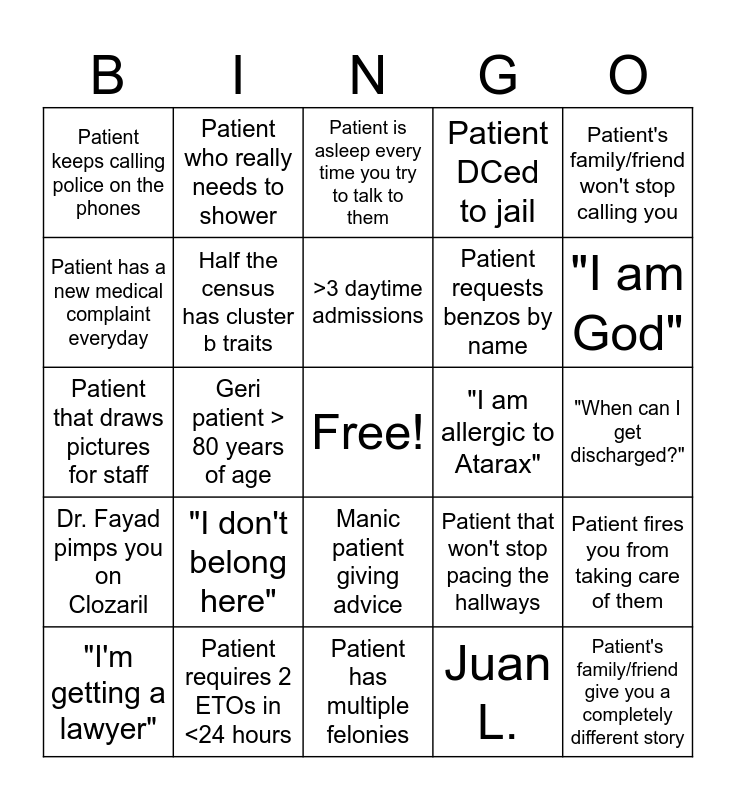 This bingo card has a free space and 24 words: "I don't belong here", Patient requires 2 ETOs in <24 hours, >3 daytime admissions, "I'm getting a lawyer", Patient's family/friend won't stop calling you, Patient keeps calling police on the phones, Patient has a new medical complaint everyday, Patient who really needs to shower, "I am allergic to Atarax", Manic patient giving advice, Patient requests benzos by name, Patient that draws pictures for staff, Patient that won't stop pacing the hallways, Patient fires you from taking care of them, Half the census has cluster b traits, Juan L., "When can I get discharged?", Patient is asleep every time you try to talk to them, "I am God", Geri patient > 80 years of age, Patient's family/friend give you a completely different story, Dr. Fayad pimps you on Clozaril, Patient DCed to jail and Patient has multiple felonies.