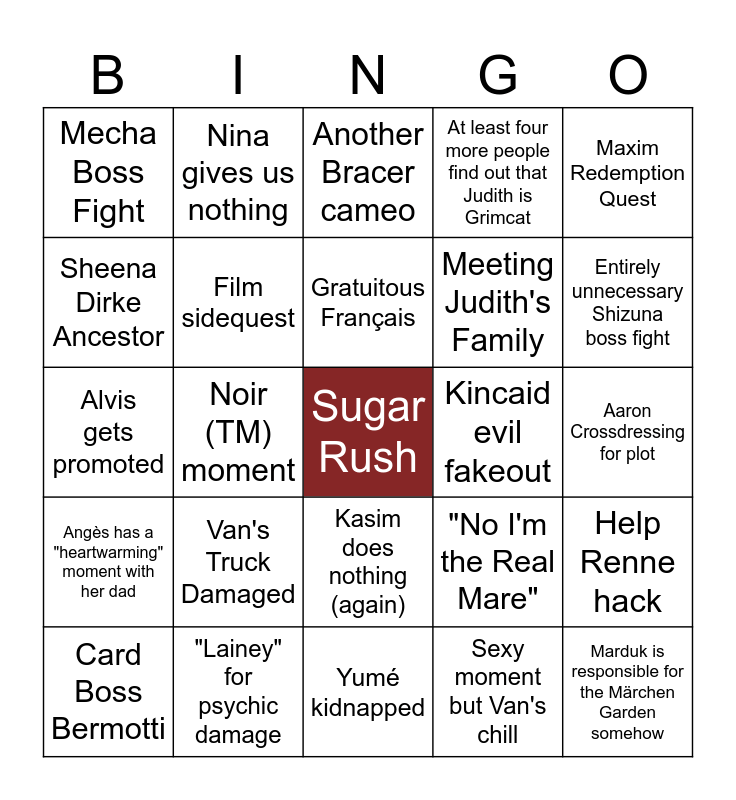 This bingo card has a free space and 24 words: Van's Truck Damaged, "Lainey" for psychic damage, Gratuitous Français, Card Boss Bermotti, Maxim Redemption Quest, Mecha Boss Fight, Sheena Dirke Ancestor, Nina gives us nothing, Kincaid evil fakeout, Kasim does nothing (again), Meeting Judith's Family, Alvis gets promoted, "No I'm the Real Mare", Help Renne hack, Film sidequest, Sexy moment but Van's chill, Aaron Crossdressing for plot, Another Bracer cameo, Entirely unnecessary Shizuna boss fight, Noir (TM) moment, Marduk is responsible for the Märchen Garden somehow, Angès has a "heartwarming" moment with her dad, At least four more people find out that Judith is Grimcat and Yumé kidnapped.