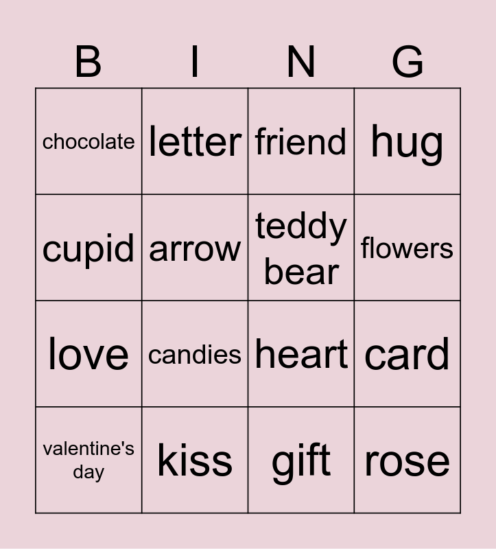This bingo card has 16 words: kiss, card, friend, chocolate, love, letter, heart, gift, cupid, arrow, valentine's day, hug, candies, flowers, teddy bear and rose.