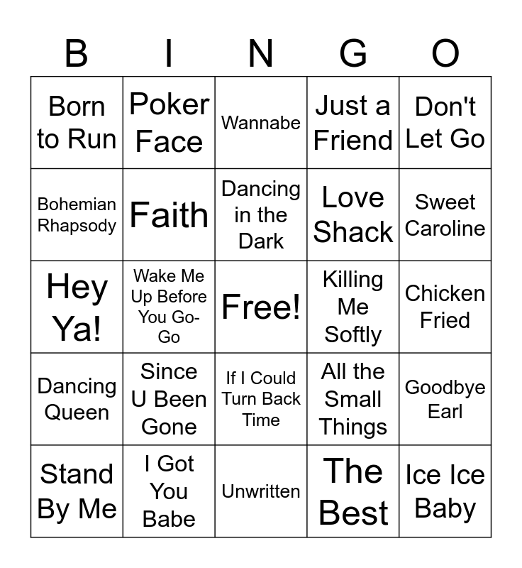 This bingo card has a free space and 84 words: Like A Prayer, Bye Bye Bye, Wannabe, My Way, Take on Me, Juice, I Wanna Dance with Somebody, I Will Survive, I Want it That Way, Don't Stop Believin', Africa, Someone Like You, Faith, Killing Me Softly, Sweet Dreams, Born to Run, Stand By Me, Bohemian Rhapsody, These Boots are Made for Walkin', Rehab, Party in the U.S.A., Love Shack, Ice Ice Baby, (You Gotta) Fight For Your Right (To Party!), Wake Me Up Before You Go-Go, Islands in the Stream, My Girl, Brown Eyed Girl, Girl On Fire, You've Lost that Lovin' Feelin', Since U Been Gone, Sweet Child of Mine, Hold On, Hey Ya!, What's Up?, Livin' on a Prayer, Unwritten, Livin' La Vida Loca, Sweet Caroline, Dancing Queen, Hotel California, Piano Man, Alone, Friends in Low Places, It's All Coming Back to Me Now, Respect, Poker Face, 9 to 5, No Scrubs, Work It, Margaritaville, All the Small Things, Just a Friend, End of the Road, Stacy's Mom, We Belong, I Got You Babe, Dancing in the Dark, This is How We Do It, Chicken Fried, Uptown Funk, Hey Jude, Wagon Wheel, Shallow, Don't Go Breaking My Heart, Summer of '69, Uptown Girl, Come on Eileen, Don't Let Go, Umbrella, Goodbye Earl, I Love Rock N Roll, Billie Jean, Don't Stop Me Now, If I Could Turn Back Time, The Best, Proud Mary, You Give Love a Bad Name, Rocket Man, Beat It, Time after Time, Closing Time, Low and Mama's Don't Let Your Baby's Grow Up to Be Cowboys.