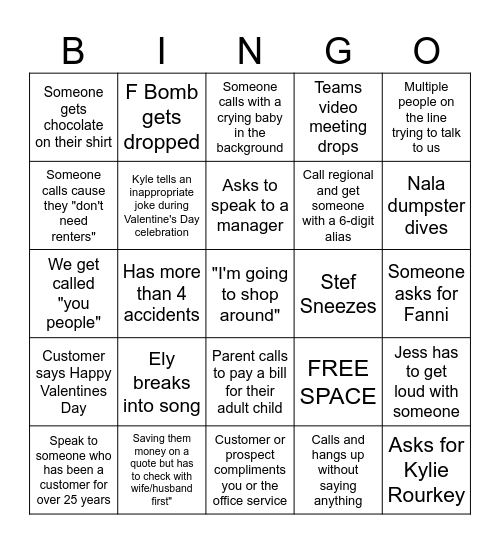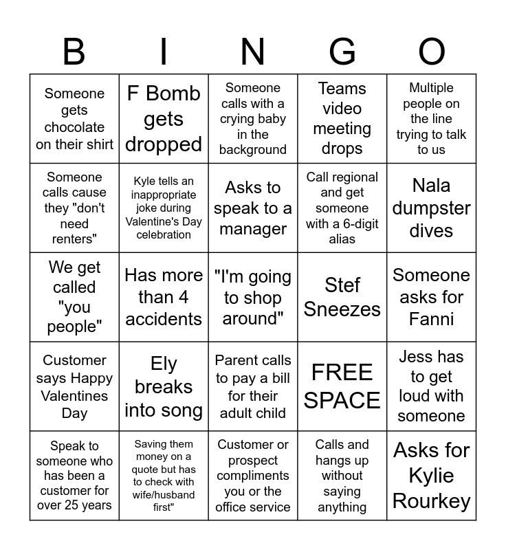 This bingo card has 25 words: Ely breaks into song, Customer or prospect compliments you or the office service, Asks to speak to a manager, Speak to someone who has been a customer for over 25 years, Multiple people on the line trying to talk to us, Someone gets chocolate on their shirt, Someone calls cause they "don't need renters", F Bomb gets dropped, Stef Sneezes, Parent calls to pay a bill for their adult child, Call regional and get someone with a 6-digit alias, We get called "you people", FREE SPACE, Jess has to get loud with someone, Kyle tells an inappropriate joke during Valentine's Day celebration, Asks for Kylie Rourkey, Someone asks for Fanni, Someone calls with a crying baby in the background, Nala dumpster dives, Has more than 4 accidents, "I'm going to shop around", Saving them money on a quote but has to check with wife/husband first", Customer says Happy Valentines Day, Teams video meeting drops and Calls and hangs up without saying anything.