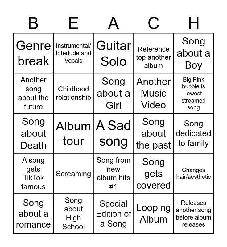 This bingo card has a free space and 24 words: Screaming, Song about High School, Song about a Girl, Song about a romance, Song about a Boy, Genre break, Another song about the future, Instrumental/ Interlude and Vocals, Song about the past, Song from new album hits #1, Another Music Video, Song about Death, Song gets covered, Changes hair/aesthetic, Childhood relationship, Looping Album, Song dedicated to family, Guitar Solo, Big Pink bubble is lowest streamed song, Album tour, Releases another song before album releases, A song gets TikTok famous, Reference top another album and Special Edition of a Song.