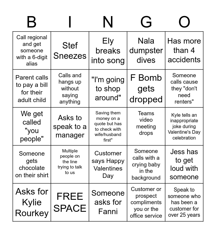 This bingo card has 25 words: Multiple people on the line trying to talk to us, Someone asks for Fanni, "I'm going to shop around", Asks for Kylie Rourkey, Has more than 4 accidents, Call regional and get someone with a 6-digit alias, Parent calls to pay a bill for their adult child, Stef Sneezes, Teams video meeting drops, Customer says Happy Valentines Day, F Bomb gets dropped, We get called "you people", Someone calls with a crying baby in the background, Jess has to get loud with someone, Calls and hangs up without saying anything, Speak to someone who has been a customer for over 25 years, Kyle tells an inappropriate joke during Valentine's Day celebration, Ely breaks into song, Someone calls cause they "don't need renters", Asks to speak to a manager, Saving them money on a quote but has to check with wife/husband first", FREE SPACE, Someone gets chocolate on their shirt, Nala dumpster dives and Customer or prospect compliments you or the office service.
