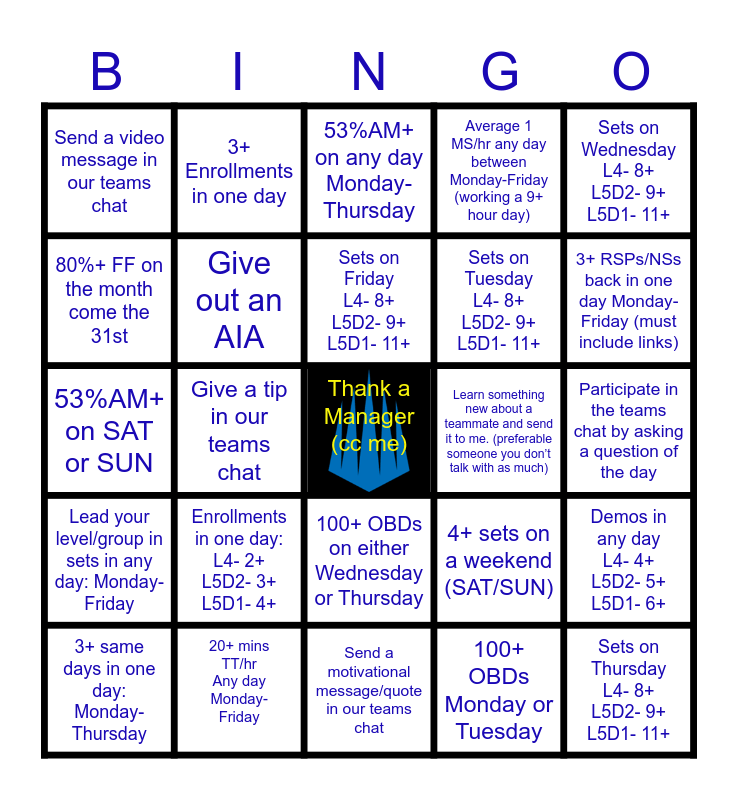 This bingo card has a free space and 24 words: Enrollments in one day: L4- 2+ L5D2- 3+ L5D1- 4+, 20+ mins TT/hr Any day Monday-Friday, Sets on Friday L4- 8+ L5D2- 9+ L5D1- 11+, 3+ same days in one day: Monday-Thursday, Sets on Wednesday L4- 8+ L5D2- 9+ L5D1- 11+, Send a video message in our teams chat, 80%+ FF on the month come the 31st, 3+ Enrollments in one day, Learn something new about a teammate and send it to me. (preferable someone you don’t talk with as much), 100+ OBDs on either Wednesday or Thursday, Sets on Tuesday L4- 8+ L5D2- 9+ L5D1- 11+, 53%AM+ on SAT or SUN, 4+ sets on a weekend (SAT/SUN), Demos in any day L4- 4+ L5D2- 5+ L5D1- 6+, Give out an AIA, 100+ OBDs Monday or Tuesday, Participate in the teams chat by asking a question of the day, 53%AM+ on any day Monday-Thursday, 3+ RSPs/NSs back in one day Monday-Friday (must include links), Give a tip in our teams chat, Sets on Thursday L4- 8+ L5D2- 9+ L5D1- 11+, Lead your level/group in sets in any day: Monday-Friday, Average 1 MS/hr any day between Monday-Friday (working a 9+ hour day) and Send a motivational message/quote in our teams chat.