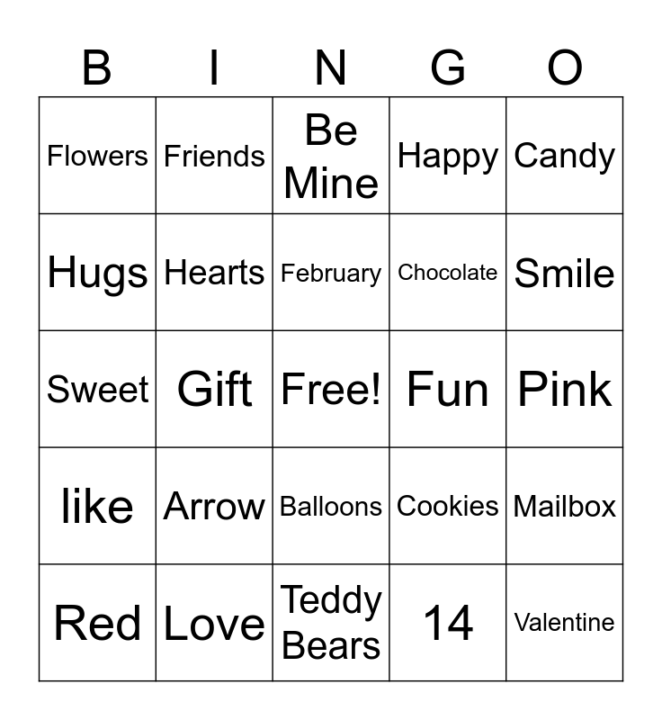 This bingo card has a free space and 24 words: Arrow, Love, February, Red, Candy, Flowers, Hugs, Friends, Fun, Balloons, Chocolate, Sweet, Cookies, Mailbox, Hearts, 14, Pink, Be Mine, Smile, Gift, Valentine, like, Happy and Teddy Bears.