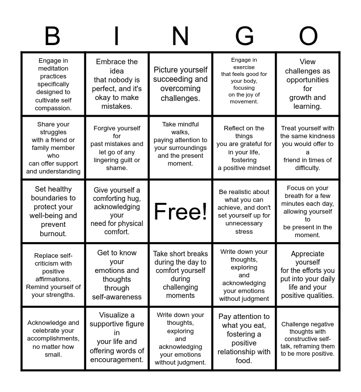 This bingo card has a free space and 24 words: Get to know your emotions and thoughts through self-awareness, Visualize a supportive figure in your life and offering words of encouragement., Take mindful walks, paying attention to your surroundings and the present moment., Acknowledge and celebrate your accomplishments, no matter how small., View challenges as opportunities for growth and learning., Engage in meditation practices specifically designed to cultivate self compassion., Share your struggles with a friend or family member who can offer support and understanding, Embrace the idea that nobody is perfect, and it's okay to make mistakes., Be realistic about what you can achieve, and don't set yourself up for unnecessary stress, Take short breaks during the day to comfort yourself during challenging moments, Reflect on the things you are grateful for in your life, fostering a positive mindset, Set healthy boundaries to protect your well-being and prevent burnout., Write down your thoughts, exploring and acknowledging your emotions without judgment, Appreciate yourself for the efforts you put into your daily life and your positive qualities., Forgive yourself for past mistakes and let go of any lingering guilt or shame., Pay attention to what you eat, fostering a positive relationship with food., Focus on your breath for a few minutes each day, allowing yourself to be present in the moment., Picture yourself succeeding and overcoming challenges., Treat yourself with the same kindness you would offer to a friend in times of difficulty., Give yourself a comforting hug, acknowledging your need for physical comfort., Challenge negative thoughts with constructive self-talk, reframing them to be more positive., Replace self-criticism with positive affirmations. Remind yourself of your strengths., Engage in exercise that feels good for your body, focusing on the joy of movement. and Write down your thoughts, exploring and acknowledging your emotions without judgment..