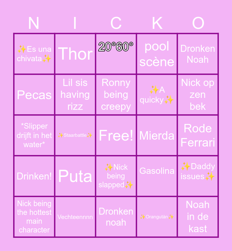 This bingo card has a free space and 24 words: Puta, Vechteennnn, Ronny being creepy, Nick being the hottest main character, Dronken Noah, ✨Es una chivata✨, Pecas, Thor, Mierda, ✨Nick being slapped✨, ✨A quicky✨, *Slipper drijft in het water*, Gasolina, ✨Daddy issues✨, Lil sis having rizz, ✨Orangutàn✨, Rode Ferrari, 20°60°, Nick op zen bek, ✨Staarbattle✨, Noah in de kast, Drinken!, pool scène and Dronken noah.