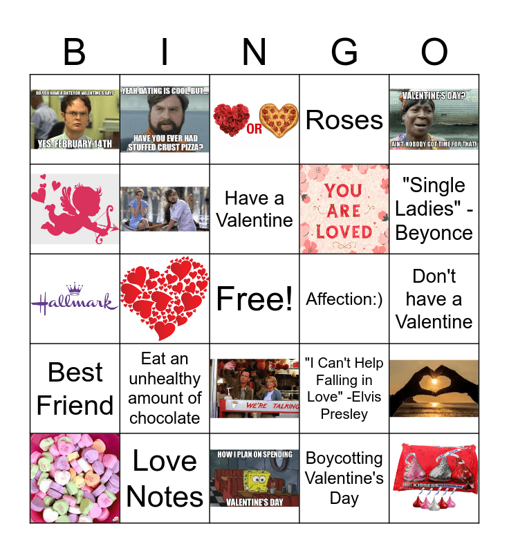 This bingo card has 17 images, a free space and 22 words: Poem, Have gotten a box of chocolates on Valentines day, Spent Valentines day watching netflix, Have a Valentine, Candy hearts, Best Friend, Roses, Don't have a Valentine, Affection:), Eat an unhealthy amount of chocolate, "Just the Way You Are" -Bruno Mars, "I Can't Help Falling in Love" -Elvis Presley, "Single Ladies" -Beyonce, Being alone, Being with friends, Watch Valentines comedy movie, Watch Valentines romantic movie, Galentine's, Teddy Bears, Love Notes, Boycotting Valentine's Day and All you need is....