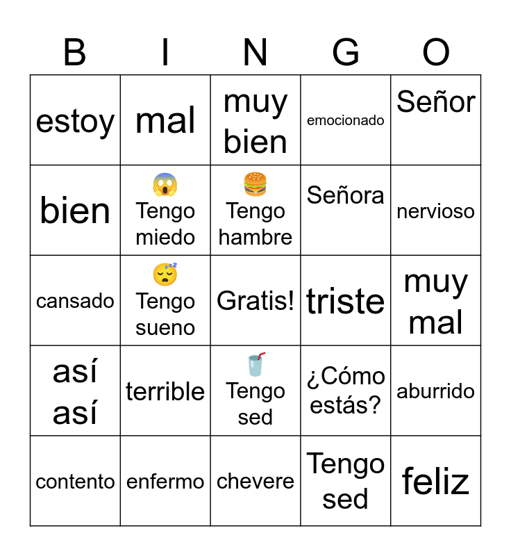 This bingo card has a free space and 27 words: ¿Cómo estás?, ¿Y tú?, Señora, chevere, bien, muy bien, mal, así así, triste, aburrido, cansado, emocionado, contento, enfermo, nervioso, enojado, 😱Tengo miedo, 🍔Tengo hambre, terrible, estoy, muy mal, Tengo sed, 😴Tengo sueno, feliz, 🥤Tengo sed, Señor and Señorita.