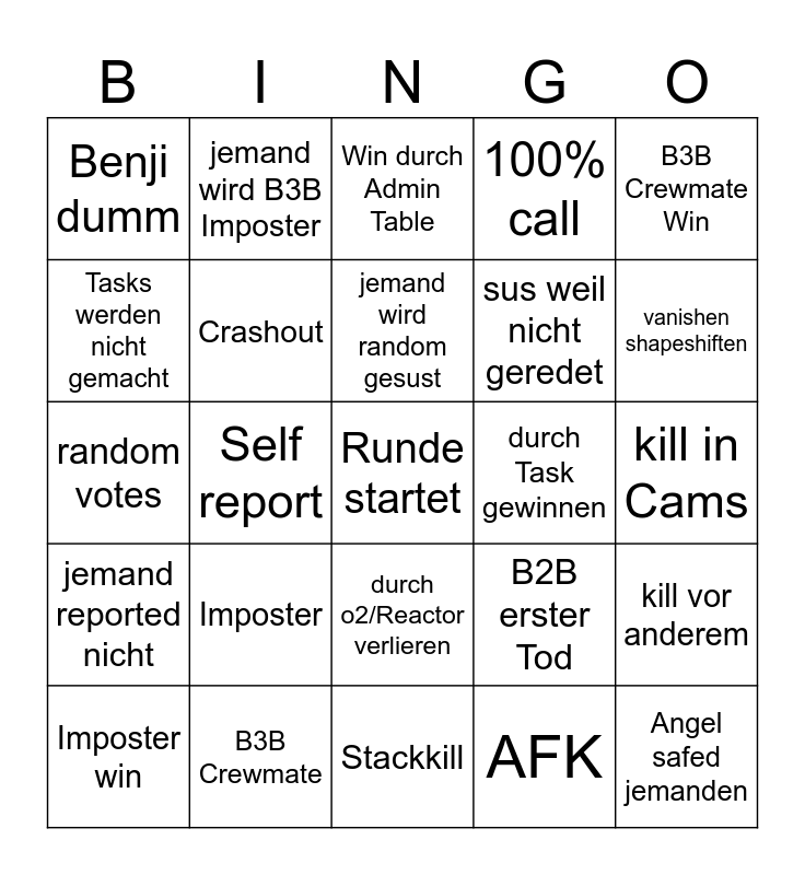 This bingo card has a free space and 24 words: Imposter, B3B Crewmate, jemand wird random gesust, Imposter win, B3B Crewmate Win, Benji dumm, Tasks werden nicht gemacht, jemand wird B3B Imposter, durch Task gewinnen, durch o2/Reactor verlieren, sus weil nicht geredet, random votes, B2B erster Tod, kill vor anderem, Crashout, AFK, kill in Cams, Win durch Admin Table, vanishen shapeshiften, Self report, Angel safed jemanden, jemand reported nicht, 100% call and Stackkill.
