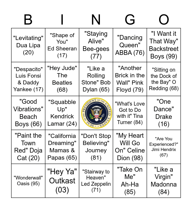 This bingo card has a free space and 44 words: "Hips Don't Lie" Shakira (06), "Like a Virgin" Madonna (84), "Umbrella" Rihanna (07), "Wonderwall" Oasis (95), "Waterfalls" TLC (95), "Take On Me" Ah-Ha (85), "Staying Alive" Bee-gees (77), "Hail to the Chief" (1812), "I Want it That Way" Backstreet Boys (99), "Hey Ya" Outkast (03), "Dancing Queen" ABBA (76), "What's Love Got to Do with it" Tina Turner (84), "Don't Stop Believing" Journey (81), "California Dreaming" Mamas & Papas (65), "24K Magic" Bruno Mars (14), "Stairway to Heaven" Led Zeppelin (71), "I want to Dance with Somebody" Whitney Houston (87), "Good Vibrations" Beach Boys (66), "I Can't Get No Satisfaction" Rolling Stones (65), "Sitting on the Dock of the Bay" O Redding (68), "Shape of You" Ed Sheeran (17), "I Fee Love" Donna Summer (77), "California Love" Tupac (95), "Levitating" Dua Lipa (20), "Bohemian Rhapsody" Queen 75), "One Dance" Drake (16), Smells Lie Teen Spirit" Nirvana (91), "Flowers" Miley Cyrus (23), "My Heart Will Go On" Celine Dion (98), "Paint the Town Red" Doja Cat (20), "Purple Rain" Prince (84), "Are You Experienced?" Jimi Hendrix (67), "Blinding Lights" The Weeknd (20), "Rolling in the Deep" Adele (10), "Squabble Up" Kendrick Lamar (24), "U Can't Touch This" MC Hammer (90), "Respect" Aretha Franklin (67), "Thriller" Michael Jackson (82), "Like a Rolling Stone" Bob Dylan (65), "Despacito" Luis Fonsi & Daddy Yankee (17), "Another Brick in the Wall" Pink Floyd (79), "Living n a Prayer" Bon Jovi (86), "Hey Jude" The Beatles (68) and "Blank Space Taylor Swift (14).