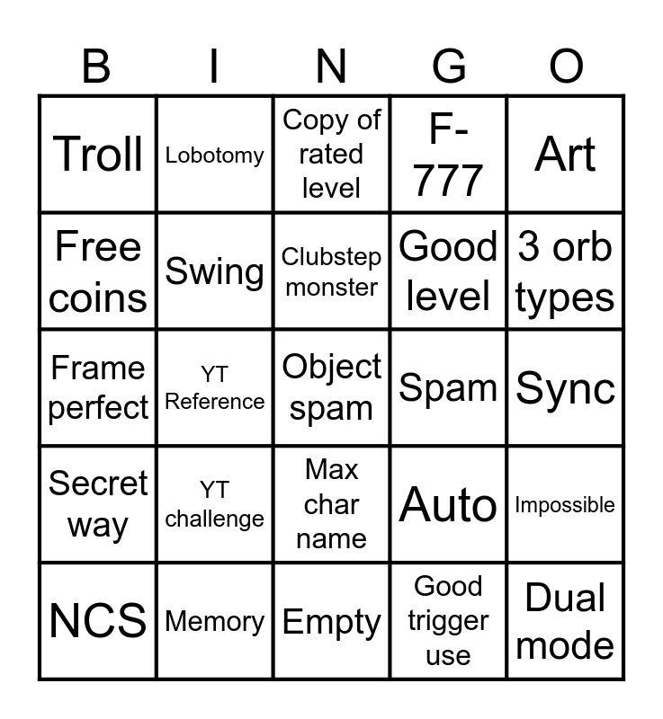 This bingo card has 25 words: YT challenge, Empty, Clubstep monster, NCS, Art, Troll, Free coins, Lobotomy, Spam, Max char name, Good level, Frame perfect, Auto, Impossible, Swing, Dual mode, Sync, Copy of rated level, 3 orb types, YT Reference, Object spam, Memory, Secret way, F-777 and Good trigger use.