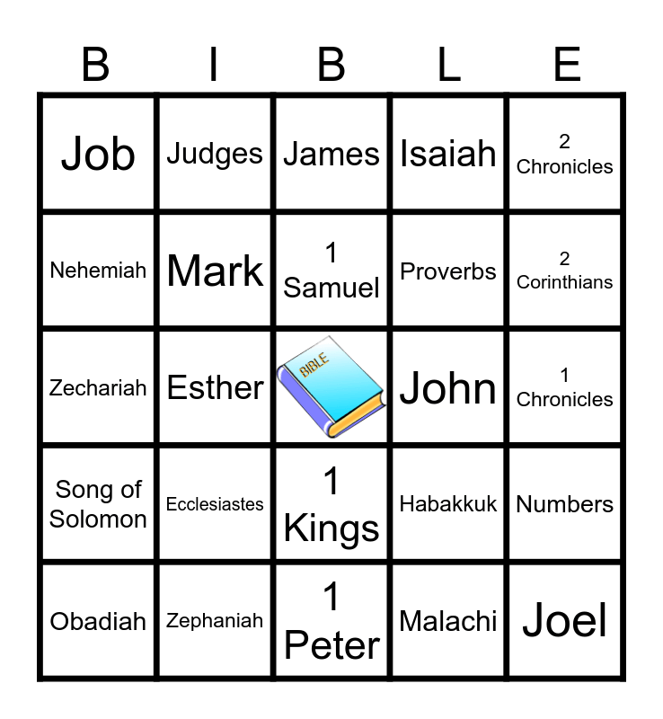 This bingo card has a free space and 66 words: Genesis, Exodus, Leviticus, Numbers, Deuteronomy, Joshua, Judges, Ruth, 1 Samuel, 2 Samuel, 1 Kings, 2 Kings, 1 Chronicles, 2 Chronicles, Ezra, Nehemiah, Esther, Job, Psalms (The middle of the Bible*), Proverbs, Ecclesiastes, Song of Solomon, Isaiah, Jeremiah, Lamentations, Ezekiel, Daniel, Hosea, Joel, Amos, Obadiah, Jonah, Micah, Nahum, Habakkuk, Zephaniah, Haggai, Zechariah, Malachi, Matthew (New Testament begins), Mark, Luke, John, Acts, Romans, 1 Corinthians, 2 Corinthians, Galatians, Ephesians, Philippians, Colossians, 1 Thessalonians, 2 Thessalonians, 1 Timothy, 2 Timothy, Titus, Philemon, Hebrews, James, 1 Peter, 2 Peter, 1 John, 2 John, 3 John, Jude and Revelation.