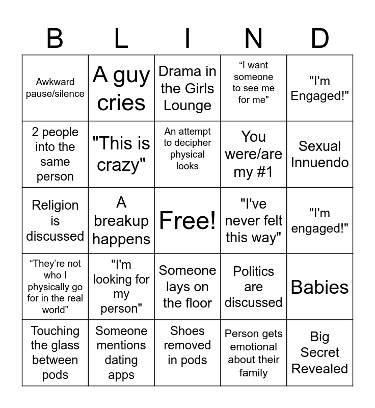 This bingo card has a free space and 24 words: "I'm looking for my person", Someone mentions dating apps, An attempt to decipher physical looks, Touching the glass between pods, "I'm Engaged!", Awkward pause/silence, 2 people into the same person, A guy cries, "I've never felt this way", Someone lays on the floor, You were/are my #1, Religion is discussed, Politics are discussed, Babies, "This is crazy", Person gets emotional about their family, "I'm engaged!", Drama in the Girls Lounge, Sexual Innuendo, A breakup happens, Big Secret Revealed, “They’re not who I physically go for in the real world”, “I want someone to see me for me" and Shoes removed in pods.