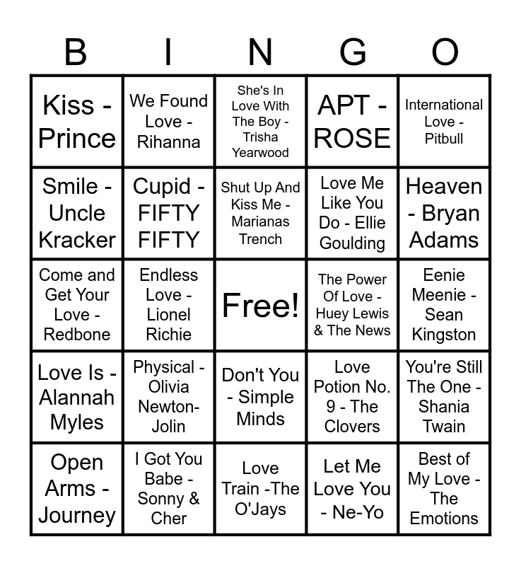 This bingo card has a free space and 102 words: Fire - The Faim, Call Me Maybe - Carly Rae Jepsen, International Love - Pitbull, I'll Be - Edwin McCain, Love T.K.O. - Teddy Pendergrass, I Was Made For Lovin' You - KISS, Crazy Little Thing Called Love - Queen, Flowers Need Rain - Preston Pablo, Can You Feel the Love Tonight, Crazy In Love - Beyoncé, Everyday - Buddy Holly, DJ Got Us Fallin' In Love - USHER, Love Like Woe -The Ready Set, Somebody Like You - Keith Urban, Truly Madly Deeply - Savage Garden, All of Me - John Legend, Love Is - Alannah Myles, Uptown Girl - Billy Joel, Sweet Caroline - Neil Diamond, Just the Way You Are - Bruno Mars, You Sexy Thing - Hot Chocolate, Let Your Love Flow - The Bellamy Brothers, I Want It That Way - Backstreet Boys, Closer - Tegan and Sara, Everybody Loves Somebody - Dean Martin, Heaven - Bryan Adams, АРТ - ROSE, Physical - Olivia Newton-Jolin, One Call Away - Charlie Puth, I'm a Believer - The Monkees, We Found Love - Rihanna, She's In Love With The Boy - Trisha Yearwood, Falling In Love With You - UB40, I'm Yours - Jason Mraz, Don't Get Me Wrong - Pretenders, Don't You - Simple Minds, As It Was - Harry Styles, Kiss from a Rose - Seal, Come and Get Your Love - Redbone, Let Me Love You - Ne-Yo, Baby I Love Your Way - Big Mountain, A Thousand Miles - Vanessa Carlton, Open Arms - Journey, Baby - Justin Bieber, Wishing - A Flock Of Seagulls, I Do - 98°, Love Machine - Wham!, Love Me Like You Do - Ellie Goulding, Down - Jay Sean, My Girl - The Temptations, That's How You Know - Amy Adams, Without You - David Guetta, Smile - Uncle Kracker, I'm Gonna Be - The Proclaimers, Accidentally In Love - Counting Crows, Teenage Dream - Katy Perry, Maps - Maroon 5, Put Your Head on My Shoulder - Paul Anka, Shape of You - Ed Sheeran, Best of My Love - The Emotions, Your Love Is My Drug - Kesha, Flowers - Miley Cyrus, Replay - lyaz, Your Man - Down With Webster, Love Story - Taylor Swift, Bad Romance - Lady Gaga, How Deep Is Your Love - Calvin Harris, Eenie Meenie - Sean Kingston, Endless Love - Lionel Richie, I Got You Babe - Sonny & Cher, Do You Love Me - The Contours, Girlfriend - Avril Lavigne, I Think I Love You - The Partridge Family, Some Kind Of Wonderful - Grand Funk Railroad, I Won't Say (I'm In Love) - Susan Egan, Tongue Tied - Faber Drive, Cupid - FIFTY FIFTY, Better Together - Jack Johnson, Red Wine Supernova - Chappell Roan, Take on Me - A-Ha, Lay All Your Love On Me - A*Teens, Stand By Me - Ben E. King, I'm Still in Love With You - Alton Ellis, The Power Of Love - Huey Lewis & The News, Sugar Sugar - The Archies, Shut Up And Kiss Me - Marianas Trench, What Is Love - Haddaway, Angel - Akon, I Need Your Love - Calvin Harris, Ain't No Mountain High Enough - Marvin Gaye, Marry Me - Train, Love Potion No. 9 - The Clovers, Crazy Stupid Love - Cheryl, How Deep Is Your Love - Bee Gees, Endlessly - The Cab, Love Train -The O'Jays, Kiss - Prince, Love You Like A Love Song - Selena Gomez, You're Still The One - Shania Twain, Into You - Ariana Grande, You Really Got Me - The Kinks and I'd Do Anything For Love - Meat Loaf.