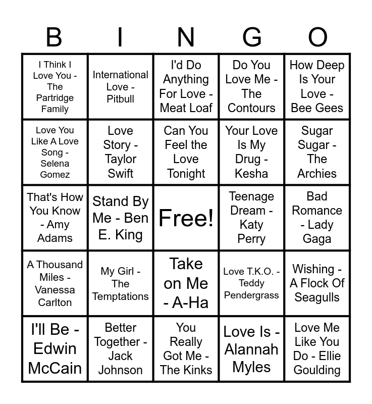 This bingo card has a free space and 102 words: I Won't Say (I'm In Love) - Susan Egan, Down - Jay Sean, How Deep Is Your Love - Bee Gees, Into You - Ariana Grande, Come and Get Your Love - Redbone, I'm Still in Love With You - Alton Ellis, I'm Gonna Be - The Proclaimers, Endlessly - The Cab, Girlfriend - Avril Lavigne, Uptown Girl - Billy Joel, Love Like Woe -The Ready Set, Open Arms - Journey, Put Your Head on My Shoulder - Paul Anka, Sweet Caroline - Neil Diamond, I Do - 98°, Closer - Tegan and Sara, A Thousand Miles - Vanessa Carlton, Somebody Like You - Keith Urban, Physical - Olivia Newton-Jolin, All of Me - John Legend, Love Machine - Wham!, Crazy Little Thing Called Love - Queen, Don't Get Me Wrong - Pretenders, As It Was - Harry Styles, Red Wine Supernova - Chappell Roan, Sugar Sugar - The Archies, Do You Love Me - The Contours, My Girl - The Temptations, Your Man - Down With Webster, Just the Way You Are - Bruno Mars, International Love - Pitbull, I'd Do Anything For Love - Meat Loaf, The Power Of Love - Huey Lewis & The News, Everyday - Buddy Holly, What Is Love - Haddaway, Take on Me - A-Ha, Angel - Akon, I Got You Babe - Sonny & Cher, That's How You Know - Amy Adams, Love Is - Alannah Myles, Don't You - Simple Minds, Maps - Maroon 5, I'll Be - Edwin McCain, Everybody Loves Somebody - Dean Martin, Kiss from a Rose - Seal, АРТ - ROSE, Replay - lyaz, Your Love Is My Drug - Kesha, Love Potion No. 9 - The Clovers, Eenie Meenie - Sean Kingston, Let Me Love You - Ne-Yo, Falling In Love With You - UB40, Love You Like A Love Song - Selena Gomez, Marry Me - Train, Endless Love - Lionel Richie, Cupid - FIFTY FIFTY, She's In Love With The Boy - Trisha Yearwood, Kiss - Prince, I Want It That Way - Backstreet Boys, Love Me Like You Do - Ellie Goulding, Lay All Your Love On Me - A*Teens, Baby I Love Your Way - Big Mountain, Best of My Love - The Emotions, Baby - Justin Bieber, I'm Yours - Jason Mraz, Tongue Tied - Faber Drive, I'm a Believer - The Monkees, Bad Romance - Lady Gaga, Stand By Me - Ben E. King, Better Together - Jack Johnson, Shut Up And Kiss Me - Marianas Trench, Let Your Love Flow - The Bellamy Brothers, Some Kind Of Wonderful - Grand Funk Railroad, Fire - The Faim, DJ Got Us Fallin' In Love - USHER, Ain't No Mountain High Enough - Marvin Gaye, Love Story - Taylor Swift, Flowers - Miley Cyrus, Smile - Uncle Kracker, Crazy Stupid Love - Cheryl, Flowers Need Rain - Preston Pablo, I Need Your Love - Calvin Harris, One Call Away - Charlie Puth, Teenage Dream - Katy Perry, Call Me Maybe - Carly Rae Jepsen, Can You Feel the Love Tonight, I Was Made For Lovin' You - KISS, You're Still The One - Shania Twain, You Sexy Thing - Hot Chocolate, Love Train -The O'Jays, Heaven - Bryan Adams, Love T.K.O. - Teddy Pendergrass, Crazy In Love - Beyoncé, Truly Madly Deeply - Savage Garden, We Found Love - Rihanna, You Really Got Me - The Kinks, I Think I Love You - The Partridge Family, Accidentally In Love - Counting Crows, Wishing - A Flock Of Seagulls, Without You - David Guetta, Shape of You - Ed Sheeran and How Deep Is Your Love - Calvin Harris.