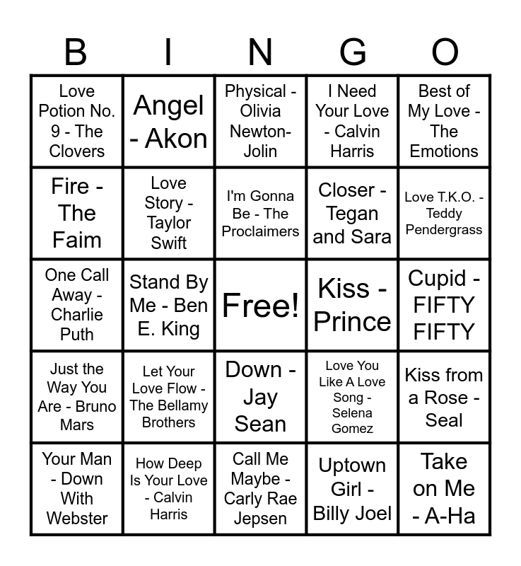This bingo card has a free space and 102 words: Teenage Dream - Katy Perry, Maps - Maroon 5, Best of My Love - The Emotions, How Deep Is Your Love - Bee Gees, Baby - Justin Bieber, Truly Madly Deeply - Savage Garden, Lay All Your Love On Me - A*Teens, She's In Love With The Boy - Trisha Yearwood, Crazy Little Thing Called Love - Queen, Shape of You - Ed Sheeran, Everybody Loves Somebody - Dean Martin, Wishing - A Flock Of Seagulls, Do You Love Me - The Contours, You Sexy Thing - Hot Chocolate, I Won't Say (I'm In Love) - Susan Egan, I'll Be - Edwin McCain, Just the Way You Are - Bruno Mars, Red Wine Supernova - Chappell Roan, АРТ - ROSE, Don't Get Me Wrong - Pretenders, I Want It That Way - Backstreet Boys, Better Together - Jack Johnson, We Found Love - Rihanna, Endless Love - Lionel Richie, Heaven - Bryan Adams, Love T.K.O. - Teddy Pendergrass, I Need Your Love - Calvin Harris, Let Your Love Flow - The Bellamy Brothers, Love Like Woe -The Ready Set, Love Train -The O'Jays, Angel - Akon, Physical - Olivia Newton-Jolin, DJ Got Us Fallin' In Love - USHER, You're Still The One - Shania Twain, Put Your Head on My Shoulder - Paul Anka, Down - Jay Sean, Accidentally In Love - Counting Crows, Without You - David Guetta, One Call Away - Charlie Puth, Uptown Girl - Billy Joel, Falling In Love With You - UB40, Can You Feel the Love Tonight, Your Man - Down With Webster, I Do - 98°, Endlessly - The Cab, Love Me Like You Do - Ellie Goulding, Flowers - Miley Cyrus, Closer - Tegan and Sara, Some Kind Of Wonderful - Grand Funk Railroad, Everyday - Buddy Holly, I Got You Babe - Sonny & Cher, I Think I Love You - The Partridge Family, Fire - The Faim, My Girl - The Temptations, Bad Romance - Lady Gaga, Come and Get Your Love - Redbone, You Really Got Me - The Kinks, Smile - Uncle Kracker, Into You - Ariana Grande, Take on Me - A-Ha, What Is Love - Haddaway, Crazy In Love - Beyoncé, I'm Still in Love With You - Alton Ellis, Let Me Love You - Ne-Yo, Sweet Caroline - Neil Diamond, Somebody Like You - Keith Urban, That's How You Know - Amy Adams, Cupid - FIFTY FIFTY, Stand By Me - Ben E. King, How Deep Is Your Love - Calvin Harris, Marry Me - Train, I'm a Believer - The Monkees, The Power Of Love - Huey Lewis & The News, Baby I Love Your Way - Big Mountain, Girlfriend - Avril Lavigne, Replay - lyaz, Love Story - Taylor Swift, Open Arms - Journey, I'm Yours - Jason Mraz, Tongue Tied - Faber Drive, Love Machine - Wham!, I Was Made For Lovin' You - KISS, All of Me - John Legend, Kiss - Prince, As It Was - Harry Styles, I'm Gonna Be - The Proclaimers, Don't You - Simple Minds, International Love - Pitbull, Ain't No Mountain High Enough - Marvin Gaye, Your Love Is My Drug - Kesha, Love Is - Alannah Myles, Love You Like A Love Song - Selena Gomez, Flowers Need Rain - Preston Pablo, I'd Do Anything For Love - Meat Loaf, A Thousand Miles - Vanessa Carlton, Call Me Maybe - Carly Rae Jepsen, Love Potion No. 9 - The Clovers, Crazy Stupid Love - Cheryl, Kiss from a Rose - Seal, Eenie Meenie - Sean Kingston, Sugar Sugar - The Archies and Shut Up And Kiss Me - Marianas Trench.