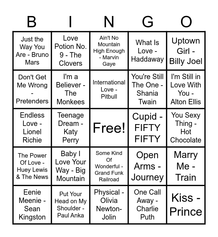 This bingo card has a free space and 102 words: Somebody Like You - Keith Urban, Come and Get Your Love - Redbone, Uptown Girl - Billy Joel, I Need Your Love - Calvin Harris, Let Your Love Flow - The Bellamy Brothers, Angel - Akon, Baby - Justin Bieber, Everybody Loves Somebody - Dean Martin, Into You - Ariana Grande, Crazy In Love - Beyoncé, Love Is - Alannah Myles, Flowers - Miley Cyrus, I Think I Love You - The Partridge Family, How Deep Is Your Love - Bee Gees, Kiss from a Rose - Seal, Can You Feel the Love Tonight, The Power Of Love - Huey Lewis & The News, АРТ - ROSE, My Girl - The Temptations, Crazy Little Thing Called Love - Queen, Bad Romance - Lady Gaga, I Do - 98°, Stand By Me - Ben E. King, Love Machine - Wham!, Let Me Love You - Ne-Yo, I'm Still in Love With You - Alton Ellis, What Is Love - Haddaway, Baby I Love Your Way - Big Mountain, Better Together - Jack Johnson, How Deep Is Your Love - Calvin Harris, Love Potion No. 9 - The Clovers, Ain't No Mountain High Enough - Marvin Gaye, Your Love Is My Drug - Kesha, Accidentally In Love - Counting Crows, Lay All Your Love On Me - A*Teens, Some Kind Of Wonderful - Grand Funk Railroad, I'd Do Anything For Love - Meat Loaf, That's How You Know - Amy Adams, Endless Love - Lionel Richie, One Call Away - Charlie Puth, Flowers Need Rain - Preston Pablo, I'm Yours - Jason Mraz, Eenie Meenie - Sean Kingston, Wishing - A Flock Of Seagulls, Closer - Tegan and Sara, We Found Love - Rihanna, Sweet Caroline - Neil Diamond, You're Still The One - Shania Twain, A Thousand Miles - Vanessa Carlton, Do You Love Me - The Contours, Don't You - Simple Minds, Crazy Stupid Love - Cheryl, Don't Get Me Wrong - Pretenders, Down - Jay Sean, DJ Got Us Fallin' In Love - USHER, Love Story - Taylor Swift, Best of My Love - The Emotions, Shut Up And Kiss Me - Marianas Trench, Love Train -The O'Jays, Kiss - Prince, Your Man - Down With Webster, I'll Be - Edwin McCain, Take on Me - A-Ha, I Got You Babe - Sonny & Cher, I Want It That Way - Backstreet Boys, Love You Like A Love Song - Selena Gomez, You Really Got Me - The Kinks, You Sexy Thing - Hot Chocolate, Teenage Dream - Katy Perry, Put Your Head on My Shoulder - Paul Anka, Love T.K.O. - Teddy Pendergrass, Without You - David Guetta, I Was Made For Lovin' You - KISS, Love Like Woe -The Ready Set, Girlfriend - Avril Lavigne, I'm Gonna Be - The Proclaimers, I'm a Believer - The Monkees, She's In Love With The Boy - Trisha Yearwood, Heaven - Bryan Adams, As It Was - Harry Styles, Fire - The Faim, Everyday - Buddy Holly, Endlessly - The Cab, Cupid - FIFTY FIFTY, Falling In Love With You - UB40, International Love - Pitbull, Sugar Sugar - The Archies, Red Wine Supernova - Chappell Roan, Maps - Maroon 5, All of Me - John Legend, Tongue Tied - Faber Drive, Open Arms - Journey, Truly Madly Deeply - Savage Garden, Smile - Uncle Kracker, Love Me Like You Do - Ellie Goulding, Physical - Olivia Newton-Jolin, Just the Way You Are - Bruno Mars, Shape of You - Ed Sheeran, Marry Me - Train, Replay - lyaz, I Won't Say (I'm In Love) - Susan Egan and Call Me Maybe - Carly Rae Jepsen.