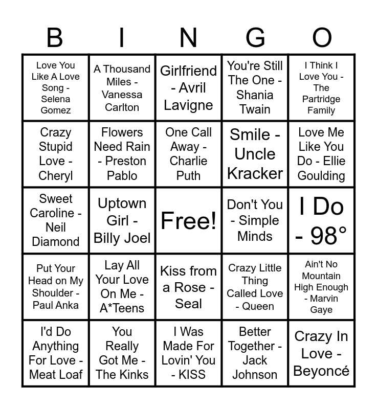 This bingo card has a free space and 102 words: Can You Feel the Love Tonight, Accidentally In Love - Counting Crows, I Think I Love You - The Partridge Family, Everyday - Buddy Holly, You Sexy Thing - Hot Chocolate, Shape of You - Ed Sheeran, I'm Gonna Be - The Proclaimers, Call Me Maybe - Carly Rae Jepsen, Shut Up And Kiss Me - Marianas Trench, Marry Me - Train, I'll Be - Edwin McCain, I'm a Believer - The Monkees, Love Potion No. 9 - The Clovers, Cupid - FIFTY FIFTY, Truly Madly Deeply - Savage Garden, What Is Love - Haddaway, Put Your Head on My Shoulder - Paul Anka, Everybody Loves Somebody - Dean Martin, I Want It That Way - Backstreet Boys, Tongue Tied - Faber Drive, Red Wine Supernova - Chappell Roan, Kiss - Prince, Love Story - Taylor Swift, Love Machine - Wham!, I Won't Say (I'm In Love) - Susan Egan, Love Me Like You Do - Ellie Goulding, You're Still The One - Shania Twain, Lay All Your Love On Me - A*Teens, Baby - Justin Bieber, Best of My Love - The Emotions, A Thousand Miles - Vanessa Carlton, Girlfriend - Avril Lavigne, DJ Got Us Fallin' In Love - USHER, My Girl - The Temptations, Into You - Ariana Grande, Kiss from a Rose - Seal, Teenage Dream - Katy Perry, Just the Way You Are - Bruno Mars, Sweet Caroline - Neil Diamond, Better Together - Jack Johnson, Open Arms - Journey, I'm Yours - Jason Mraz, I'd Do Anything For Love - Meat Loaf, Love Train -The O'Jays, Falling In Love With You - UB40, Endlessly - The Cab, Love Like Woe -The Ready Set, Smile - Uncle Kracker, Angel - Akon, Take on Me - A-Ha, I Need Your Love - Calvin Harris, Your Love Is My Drug - Kesha, Crazy Stupid Love - Cheryl, Without You - David Guetta, The Power Of Love - Huey Lewis & The News, Physical - Olivia Newton-Jolin, As It Was - Harry Styles, Come and Get Your Love - Redbone, Baby I Love Your Way - Big Mountain, Crazy In Love - Beyoncé, Some Kind Of Wonderful - Grand Funk Railroad, Somebody Like You - Keith Urban, Sugar Sugar - The Archies, How Deep Is Your Love - Calvin Harris, Don't Get Me Wrong - Pretenders, Heaven - Bryan Adams, Love Is - Alannah Myles, I Do - 98°, Uptown Girl - Billy Joel, You Really Got Me - The Kinks, Bad Romance - Lady Gaga, Down - Jay Sean, All of Me - John Legend, Flowers - Miley Cyrus, Your Man - Down With Webster, I Got You Babe - Sonny & Cher, Flowers Need Rain - Preston Pablo, Let Your Love Flow - The Bellamy Brothers, Eenie Meenie - Sean Kingston, How Deep Is Your Love - Bee Gees, Maps - Maroon 5, Endless Love - Lionel Richie, We Found Love - Rihanna, Don't You - Simple Minds, That's How You Know - Amy Adams, One Call Away - Charlie Puth, Love T.K.O. - Teddy Pendergrass, Fire - The Faim, Wishing - A Flock Of Seagulls, Do You Love Me - The Contours, АРТ - ROSE, Crazy Little Thing Called Love - Queen, Replay - lyaz, Let Me Love You - Ne-Yo, Stand By Me - Ben E. King, I Was Made For Lovin' You - KISS, Love You Like A Love Song - Selena Gomez, I'm Still in Love With You - Alton Ellis, Ain't No Mountain High Enough - Marvin Gaye, International Love - Pitbull, Closer - Tegan and Sara and She's In Love With The Boy - Trisha Yearwood.