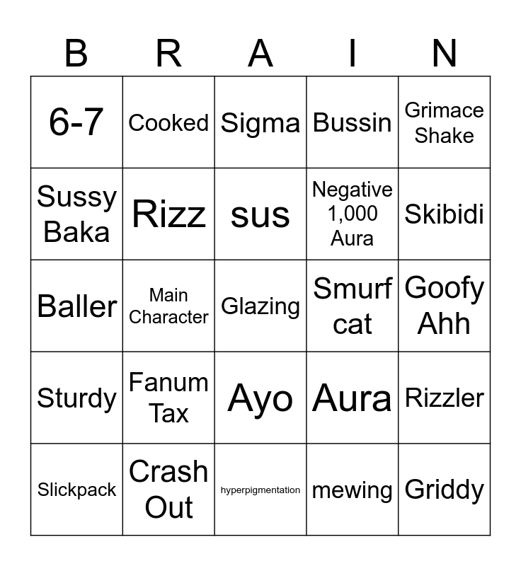 This bingo card has 28 words: Slickpack, pause, sus, mewing, Grimace Shake, Sussy Baka, Cooked, Ayo, Smurf cat, Griddy, Baller, Rizz, hyperpigmentation, Aura, Skibidi, Baby Gronk, Fanum Tax, Sigma, Bussin, Rizzler, 6-7, Crash Out, Glazing, Negative 1,000 Aura, Goofy Ahh, Sturdy, Main Character and Roblox man face.