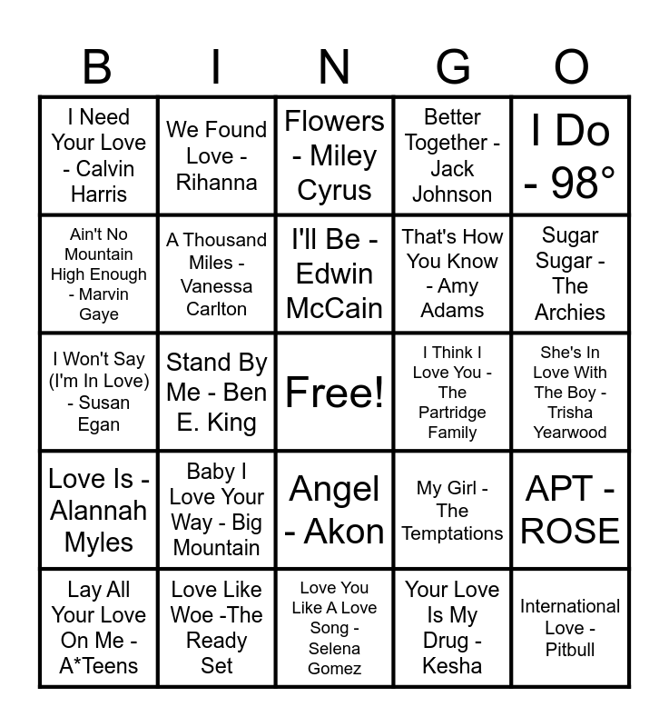 This bingo card has a free space and 102 words: Do You Love Me - The Contours, I Was Made For Lovin' You - KISS, I Do - 98°, I'm Still in Love With You - Alton Ellis, All of Me - John Legend, Don't You - Simple Minds, Shape of You - Ed Sheeran, Your Man - Down With Webster, Smile - Uncle Kracker, Crazy In Love - Beyoncé, I'm Gonna Be - The Proclaimers, Endless Love - Lionel Richie, Eenie Meenie - Sean Kingston, Let Me Love You - Ne-Yo, Shut Up And Kiss Me - Marianas Trench, I'd Do Anything For Love - Meat Loaf, Love Is - Alannah Myles, Endlessly - The Cab, As It Was - Harry Styles, I Want It That Way - Backstreet Boys, Kiss - Prince, Love Story - Taylor Swift, Cupid - FIFTY FIFTY, Teenage Dream - Katy Perry, Call Me Maybe - Carly Rae Jepsen, Sugar Sugar - The Archies, Better Together - Jack Johnson, Baby I Love Your Way - Big Mountain, Maps - Maroon 5, Love Me Like You Do - Ellie Goulding, We Found Love - Rihanna, Flowers - Miley Cyrus, Closer - Tegan and Sara, Just the Way You Are - Bruno Mars, I'm a Believer - The Monkees, Angel - Akon, Come and Get Your Love - Redbone, Love T.K.O. - Teddy Pendergrass, I Won't Say (I'm In Love) - Susan Egan, Your Love Is My Drug - Kesha, Fire - The Faim, Best of My Love - The Emotions, Lay All Your Love On Me - A*Teens, Replay - lyaz, Open Arms - Journey, Everyday - Buddy Holly, Take on Me - A-Ha, That's How You Know - Amy Adams, Uptown Girl - Billy Joel, I'm Yours - Jason Mraz, Baby - Justin Bieber, Into You - Ariana Grande, Ain't No Mountain High Enough - Marvin Gaye, Falling In Love With You - UB40, The Power Of Love - Huey Lewis & The News, Bad Romance - Lady Gaga, Physical - Olivia Newton-Jolin, Love Machine - Wham!, Marry Me - Train, International Love - Pitbull, Red Wine Supernova - Chappell Roan, Somebody Like You - Keith Urban, Everybody Loves Somebody - Dean Martin, Don't Get Me Wrong - Pretenders, DJ Got Us Fallin' In Love - USHER, You're Still The One - Shania Twain, You Really Got Me - The Kinks, She's In Love With The Boy - Trisha Yearwood, Stand By Me - Ben E. King, Love Like Woe -The Ready Set, Love Train -The O'Jays, Let Your Love Flow - The Bellamy Brothers, Girlfriend - Avril Lavigne, Down - Jay Sean, What Is Love - Haddaway, Kiss from a Rose - Seal, A Thousand Miles - Vanessa Carlton, How Deep Is Your Love - Calvin Harris, Some Kind Of Wonderful - Grand Funk Railroad, Heaven - Bryan Adams, Put Your Head on My Shoulder - Paul Anka, Love Potion No. 9 - The Clovers, One Call Away - Charlie Puth, I Think I Love You - The Partridge Family, Without You - David Guetta, I'll Be - Edwin McCain, Crazy Little Thing Called Love - Queen, How Deep Is Your Love - Bee Gees, Crazy Stupid Love - Cheryl, Sweet Caroline - Neil Diamond, Can You Feel the Love Tonight, My Girl - The Temptations, Wishing - A Flock Of Seagulls, Truly Madly Deeply - Savage Garden, Tongue Tied - Faber Drive, Love You Like A Love Song - Selena Gomez, I Need Your Love - Calvin Harris, Accidentally In Love - Counting Crows, АРТ - ROSE, I Got You Babe - Sonny & Cher, Flowers Need Rain - Preston Pablo and You Sexy Thing - Hot Chocolate.