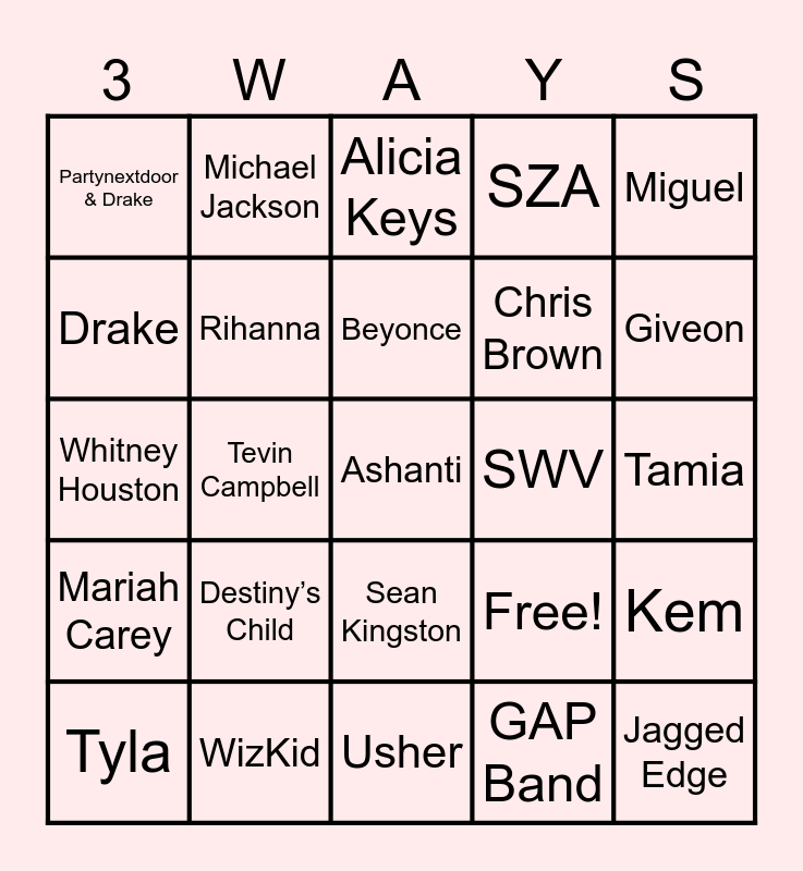 This bingo card has 27 words: Free!, Jagged Edge, Chris Brown, Usher, Drake, Alicia Keys, Michael Jackson, Mariah Carey, SWV, Kem, Whitney Houston, SZA, Tyla, WizKid, Giveon, Keyshia Cole, Rihanna, Beyonce, Destiny’s Child, Partynextdoor & Drake, Tamia, GAP Band, Tevin Campbell, Ashanti, Sean Kingston, Miguel and Wale.