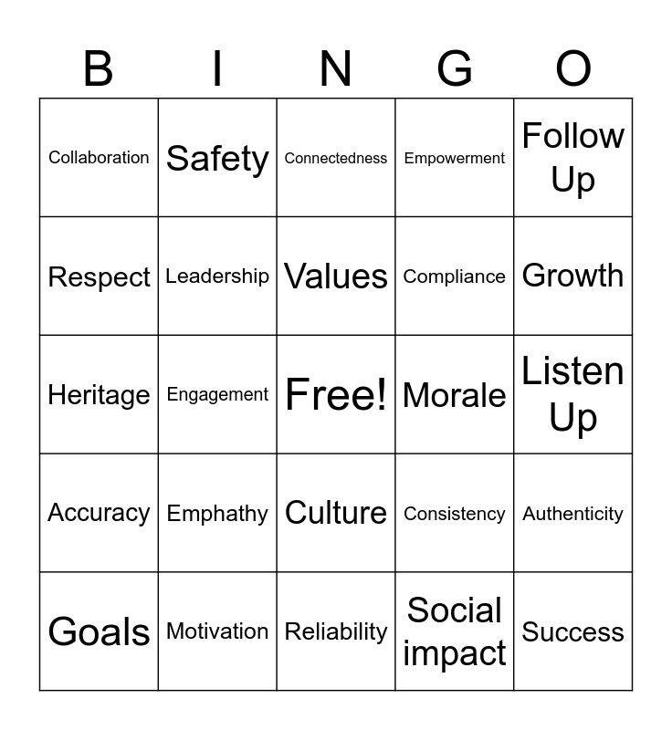 This bingo card has a free space and 68 words: People First, Success, Integrity, Diversity, Inclusion, Customers, Safety, Commitments, Values, WM, Culture, Speak Up, Listen Up, Follow Up, Trust, Respect, Engagement, Collaboration, Recognition, Emphathy, Compliance, Consistency, Accuracy, Influence, Accountability, Adaptability, Alignment, Appreciation, Authenticity, Communication, Connectedness, Credibility, Cultural alignment, Development, Empowerment, Ethics, Fairness, Goals, Growth, Heritage, Honesty, Innovation, Leadership, Learning, Legacy, Loyalty, Mentorship, Mission, Morale, Motivation, Performance, Principles, Professionalism, Reliability, Responsibility, Satisfaction, Social impact, Social responsibility, Sustainability, Synergy, Team spirit, Teamwork, Traditions, Training, Transparency, Vision, Well-being and Work-life balance.