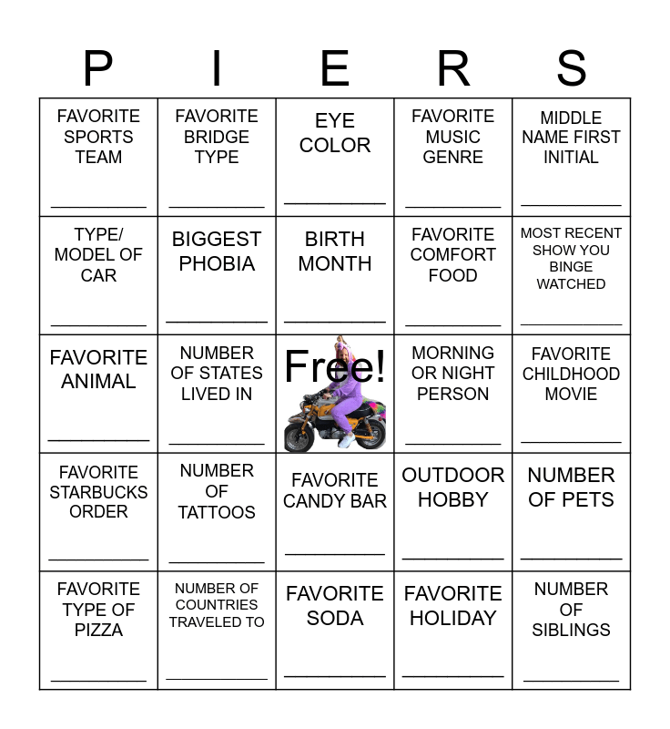 This bingo card has a free space and 24 words: NUMBER OF TATTOOS __________, NUMBER OF COUNTRIES TRAVELED TO _____________, BIRTH MONTH _________, FAVORITE TYPE OF PIZZA __________, MIDDLE NAME FIRST INITIAL ___________, FAVORITE SPORTS TEAM __________, TYPE/ MODEL OF CAR __________, FAVORITE BRIDGE TYPE __________, MORNING OR NIGHT PERSON __________, FAVORITE CANDY BAR __________, FAVORITE COMFORT FOOD __________, FAVORITE ANIMAL _________, OUTDOOR HOBBY _________, NUMBER OF PETS _________, BIGGEST PHOBIA _________, FAVORITE HOLIDAY _________, FAVORITE CHILDHOOD MOVIE ___________, EYE COLOR _________, MOST RECENT SHOW YOU BINGE WATCHED _____________, NUMBER OF STATES LIVED IN __________, NUMBER OF SIBLINGS __________, FAVORITE STARBUCKS ORDER ___________, FAVORITE MUSIC GENRE __________ and FAVORITE SODA _________.