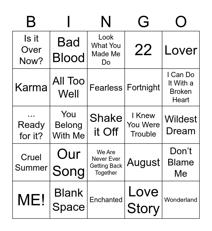 This bingo card has 25 words: Cruel Summer, Blank Space, Shake it Off, Love Story, Lover, Is it Over Now?, Bad Blood, Look What You Made Me Do, I Knew You Were Trouble, Don’t Blame Me, Karma, All Too Well, Enchanted, August, I Can Do It With a Broken Heart, ME!, You Belong With Me, Fearless, Fortnight, Wildest Dream, ... Ready for it?, Our Song, We Are Never Ever Getting Back Together, 22 and Wonderland.