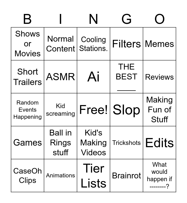 This bingo card has a free space and 24 words: CaseOh Clips, Ball in Rings stuff, Ai, Brainrot, Memes, Shows or Movies, Normal Content, Cooling Stations., Slop, Making Fun of Stuff, Random Events Happening, ASMR, Trickshots, Edits, Short Trailers, Animations, Tier Lists, Filters, Reviews, Games, Kid screaming, Kid's Making Videos, THE BEST ____ and What would happen if --------?.