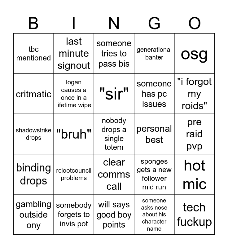 This bingo card has a free space and 24 words: rclootcouncil problems, somebody forgets to invis pot, "sir", gambling outside ony, osg, tbc mentioned, critmatic, last minute signout, personal best, clear comms call, someone has pc issues, shadowstrike drops, sponges gets a new follower mid run, hot mic, logan causes a once in a lifetime wipe, someone asks nose about his character name, pre raid pvp, someone tries to pass bis, "i forgot my roids", "bruh", tech fuckup, binding drops, generational banter and will says good boy points.