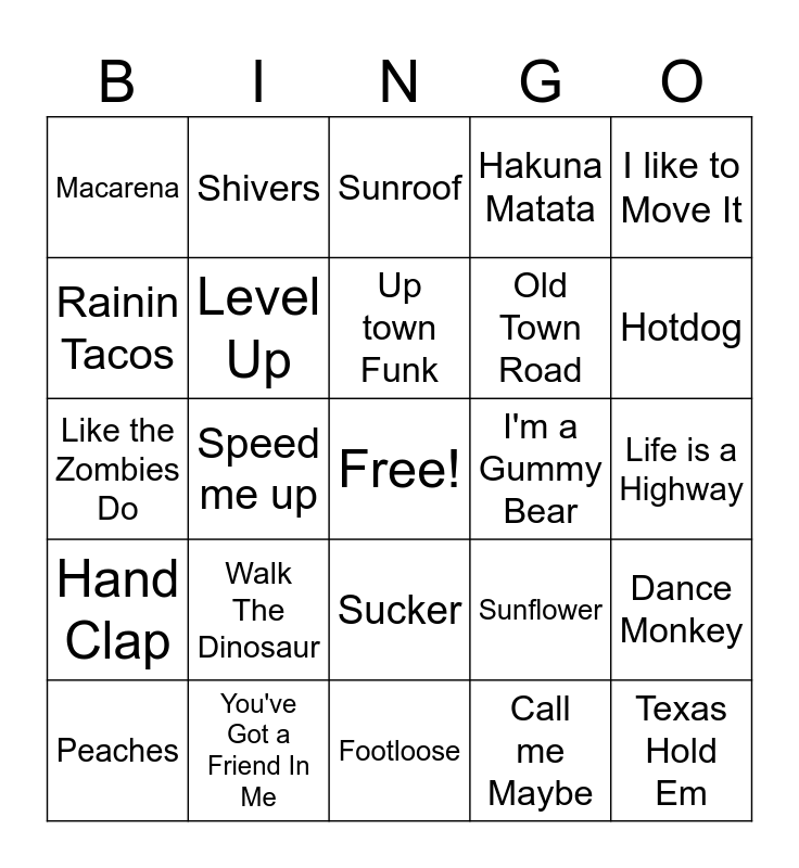 This bingo card has a free space and 48 words: Better When I'm Dancin, Texas Hold Em, Baby, Footloose, Walk The Dinosaur, S.I.M.P., Shivers, We Don't Talk About Bruno, Rainin Tacos, Veggie Dance, Level Up, Hakuna Matata, Dance Monkey, Sunflower, Can't Stop the Feeling, Dancing in The Dark, Up town Funk, I'm a Gummy Bear, Nobody like You, I like to Move It, Speed me up, Call me Maybe, Macarena, Old Town Road, Space Jam, Hotdog, Peaches, Cake by The Ocean, Sucker, Hand Clap, Shake it Off, Party Rock Anthem, I Gotta Feeling, Piece by Piece, You've Got a Friend In Me, Part of Your World, Friend Like Me, Life is a Highway, Dora The Explorer, we can't be friends, #thatPOWER, Good 4 U, Sunroof, Closer, Like the Zombies Do, Happy, Surface Pressure and Baby Shark.