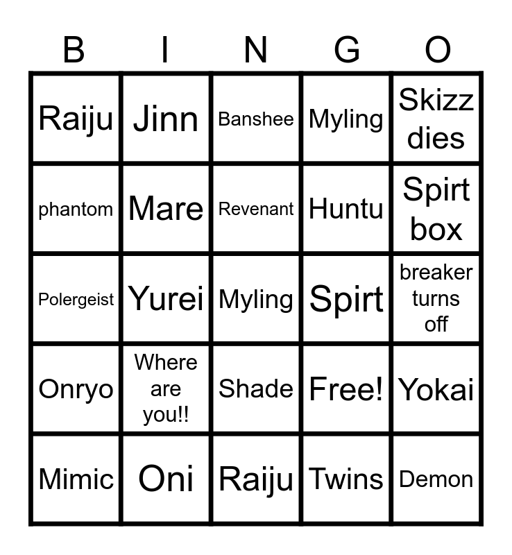 This bingo card has 25 words: Where are you!!, Raiju, Revenant, Mimic, Skizz dies, Raiju, phantom, Jinn, Spirt, Shade, Huntu, Polergeist, Free!, Yokai, Mare, Demon, breaker turns off, Banshee, Spirt box, Yurei, Myling, Oni, Onryo, Myling and Twins.