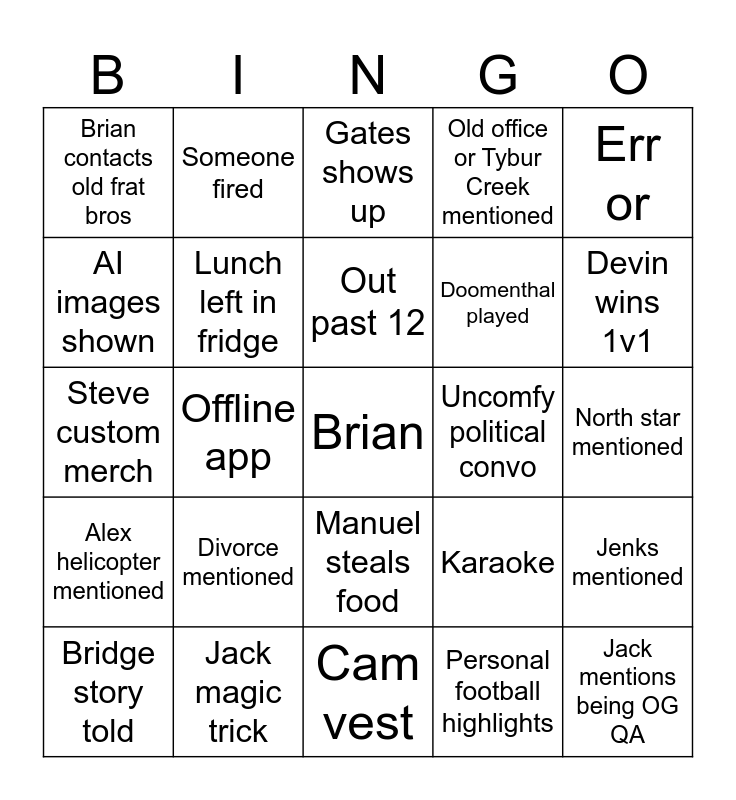 This bingo card has a free space and 34 words: Chill pills mentioned, Personal football highlights, "Problematic" remarks, VR headset appearance, Alex helicopter mentioned, Lunch left in fridge, Err or, Bridge story told, Someone fired, Injury, Out past 12, Gates shows up, Fishbowl 2024 mentioned, Yakira mentioned, Uncomfy political convo, Devin wins 1v1, Jack magic trick, Steve custom merch, Divorce mentioned, Karaoke, Manuel steals food, Someone drinks too much, Brian contacts old frat bros, North star mentioned, Cam vest, Jack mentions being OG QA, Old office or Tybur Creek mentioned, Nico Appearance, Doomenthal played, AI images shown, Whiteboard erased, Offline app, Jenks mentioned and Hertz insurance mentioned.