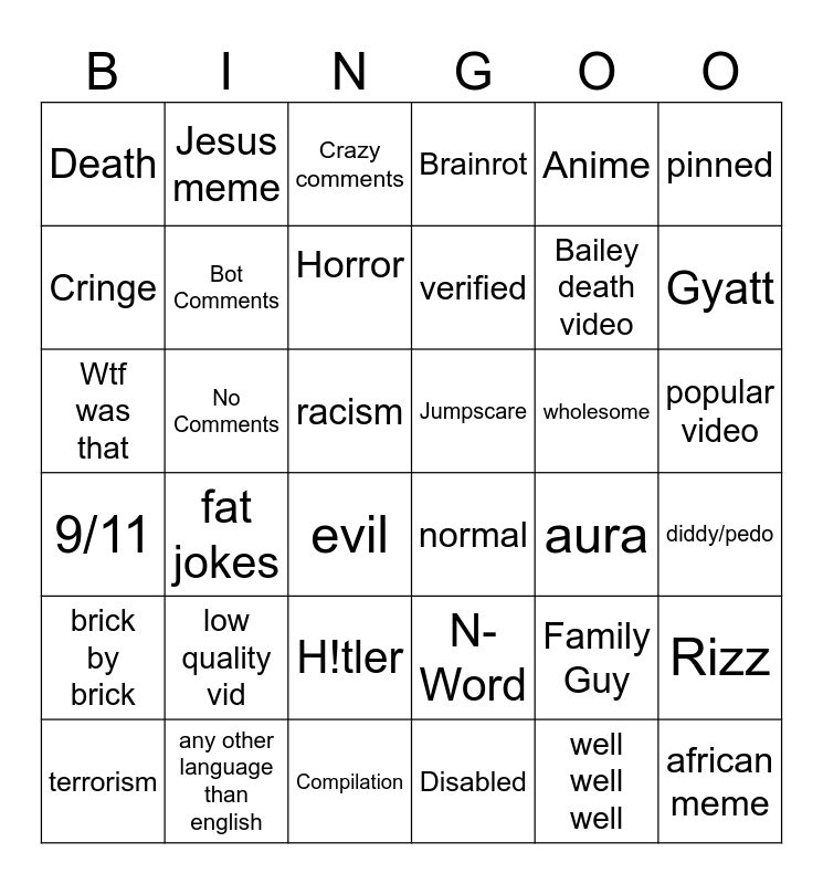 This bingo card has 36 words: N-Word, H!tler, Disabled, Cringe, 9/11, Jumpscare, Bot Comments, Compilation, Anime, Family Guy, Gyatt, Brainrot, Rizz, No Comments, verified, Death, brick by brick, wholesome, Wtf was that, Crazy comments, racism, fat jokes, normal, evil, aura, Jesus meme, Bailey death video, any other language than english, Horror, pinned, african meme, terrorism, diddy/pedo, popular video, low quality vid and well well well.