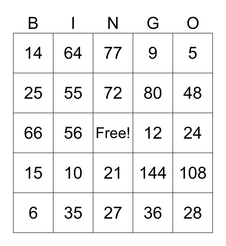 This bingo card has a free space and 24 words: 10, 35, 72, 6, 5, 14, 25, 64, 12, 21, 80, 66, 144, 108, 55, 36, 24, 77, 48, 56, 28, 15, 9 and 27.