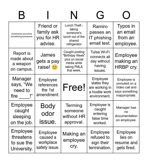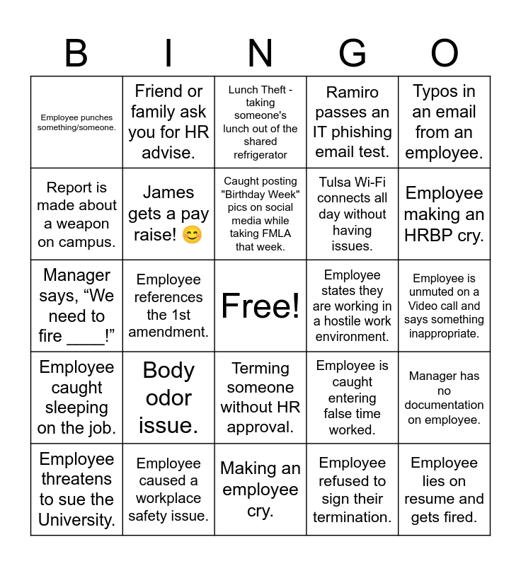 This bingo card has a free space and 32 words: Employee refused to sign their termination., Employee states they “Have a friend who works in HR…”, Employee references the 1st amendment., Employee caught drinking on the job., Employee caught sleeping on the job., James gets a pay raise! 😊, Typos in an email from an employee., Manager has no documentation on employee., Friend or family ask you for HR advise., Dress code violation., Caught posting "Birthday Week" pics on social media while taking FMLA that week., Lunch Theft - taking someone's lunch out of the shared refrigerator, Employee who works remotely who does not have remote work approvals on file., Managers skipping straight to a final for something mundane., Employee states they are working in a hostile work environment., Employee is arrested on campus., Employee threatens to sue the University., Manager says, “We need to fire ____!”, Terming someone without HR approval., Body odor issue., Employee is caught entering false time worked., Dept ask HR for recommendations but goes a different direction., Employee is unmuted on a Video call and says something inappropriate., Employee caused a workplace safety issue., Employee lies on resume and gets fired., Ramiro passes an IT phishing email test., Tulsa Wi-Fi connects all day without having issues., Report is made about a weapon on campus., Employee punches something/someone., Making an employee cry., Making more than one employee cry in a single day. and Employee making an HRBP cry..