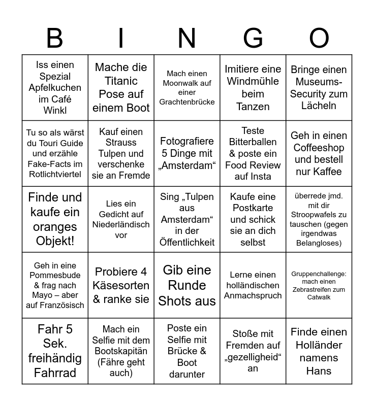This bingo card has 25 words: Probiere 4 Käsesorten & ranke sie, Poste ein Selfie mit Brücke & Boot darunter, Fotografiere 5 Dinge mit „Amsterdam“, Fahr 5 Sek. freihändig Fahrrad, Bringe einen Museums-Security zum Lächeln, Iss einen Spezial Apfelkuchen im Café Winkl, Tu so als wärst du Touri Guide und erzähle Fake-Facts im Rotlichtviertel, Mache die Titanic Pose auf einem Boot, Kaufe eine Postkarte und schick sie an dich selbst, Gib eine Runde Shots aus, Teste Bitterballen & poste ein Food Review auf Insta, Finde und kaufe ein oranges Objekt!, Lerne einen holländischen Anmachspruch, Gruppenchallenge: mach einen Zebrastreifen zum Catwalk, Kauf einen Strauss Tulpen und verschenke sie an Fremde, Finde einen Holländer namens Hans, überrede jmd. mit dir Stroopwafels zu tauschen (gegen irgendwas Belangloses), Mach einen Moonwalk auf einer Grachtenbrücke, Geh in einen Coffeeshop und bestell nur Kaffee, Lies ein Gedicht auf Niederländisch vor, Sing „Tulpen aus Amsterdam“ in der Öffentlichkeit, Mach ein Selfie mit dem Bootskapitän (Fähre geht auch), Geh in eine Pommesbude & frag nach Mayo – aber auf Französisch, Imitiere eine Windmühle beim Tanzen and Stoße mit Fremden auf „gezelligheid“ an.