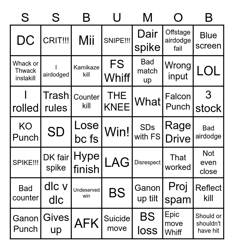 This bingo card has a free space and 48 words: SPIKE!!!, SD, AFK, LAG, Bad match up, Rage Drive, Blue screen, Ganon Punch, Trash rules, Lose bc fs, SNIPE!!!, Dair spike, Falcon Punch, 3 stock, KO Punch, dlc v dlc, Mii, THE KNEE, Ganon up tilt, Offstage airdodge fail, LOL, Whack or Thwack instakill, CRIT!!!, Kamikaze kill, BS loss, Wrong input, Bad airdodge, Bad counter, DK fair spike, Counter kill, BS, What, Proj spam, Reflect kill, DC, Gives up, Hype finish, Suicide move, SDs with FS, Epic move Whiff, Not even close, I rolled, I airdodged, Undeserved win, FS Whiff, Disrespect, That worked and Should or shouldn't have hit.