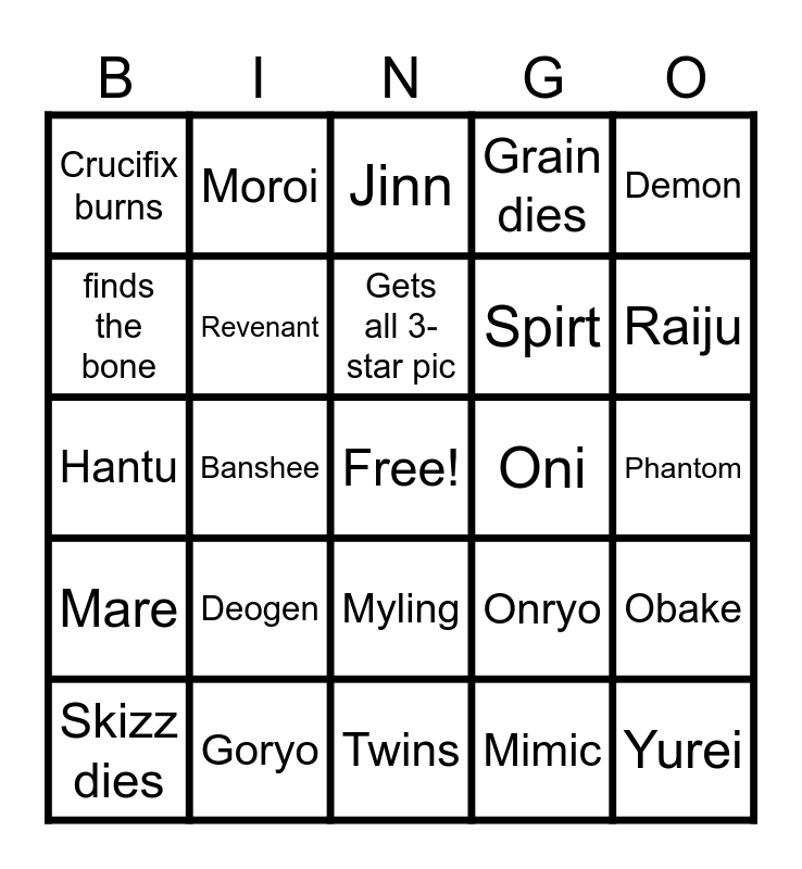 This bingo card has a free space and 29 words: Skizz dies, Wrath, Banshee, Turns off breaker, Crucifix burns, Jinn, Revenant, Deogen, Oni, Goryo, Phantom, Yurei, Twins, Mimic, Raiju, Thaye, Myling, Mare, Demon, Hantu, Onryo, Poltergeist, Spirt, finds the bone, Grain dies, Moroi, Obake, Gets all 3-star pic and Walked in salt.