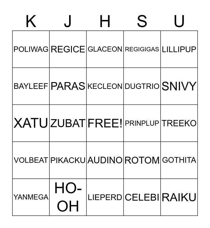 This bingo card has a free space and 24 words: PIKACKU, HO-OH, KECLEON, YANMEGA, LILLIPUP, POLIWAG, BAYLEEF, REGICE, PRINPLUP, AUDINO, DUGTRIO, XATU, ROTOM, GOTHITA, PARAS, CELEBI, TREEKO, GLACEON, SNIVY, ZUBAT, RAIKU, VOLBEAT, REGIGIGAS and LIEPERD.