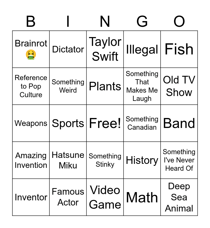 This bingo card has a free space and 24 words: Hatsune Miku, Famous Actor, Plants, Inventor, Fish, Brainrot 🤮, Reference to Pop Culture, Dictator, Something Canadian, Something Stinky, Something That Makes Me Laugh, Weapons, History, Something I've Never Heard Of, Something Weird, Math, Band, Taylor Swift, Old TV Show, Sports, Deep Sea Animal, Amazing Invention, Illegal and Video Game.