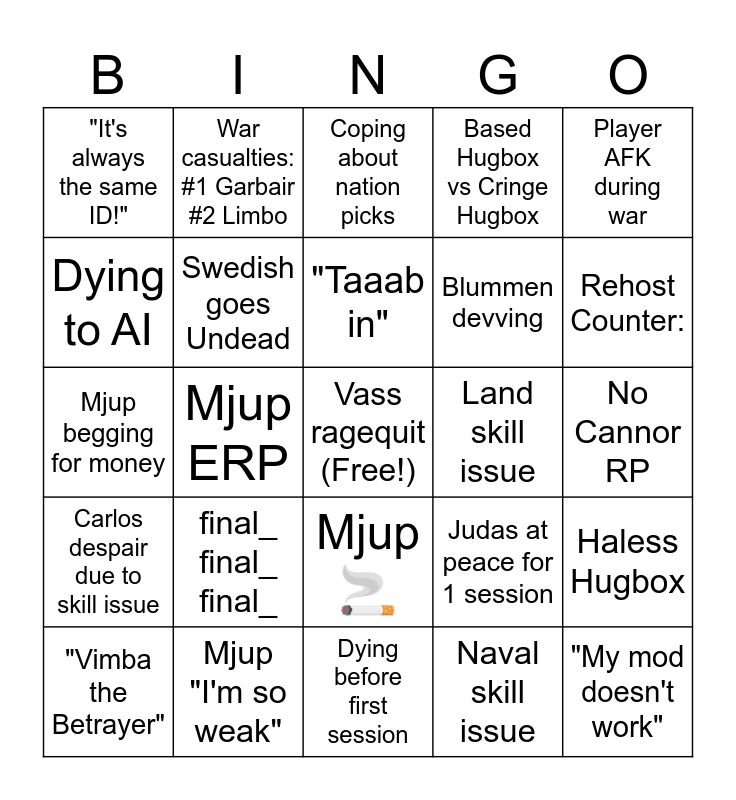 This bingo card has a free space and 24 words: final_ final_ final_, Mjup "I'm so weak", "Taaab in", "Vimba the Betrayer", Player AFK during war, "It's always the same ID!", Dying to AI, War casualties: #1 Garbair #2 Limbo, Land skill issue, Mjup 🚬, Blummen devving, Mjup begging for money, Judas at peace for 1 session, Haless Hugbox, Swedish goes Undead, Naval skill issue, No Cannor RP, Coping about nation picks, Rehost Counter:, Mjup ERP, "My mod doesn't work", Carlos despair due to skill issue, Based Hugbox vs Cringe Hugbox and Dying before first session.