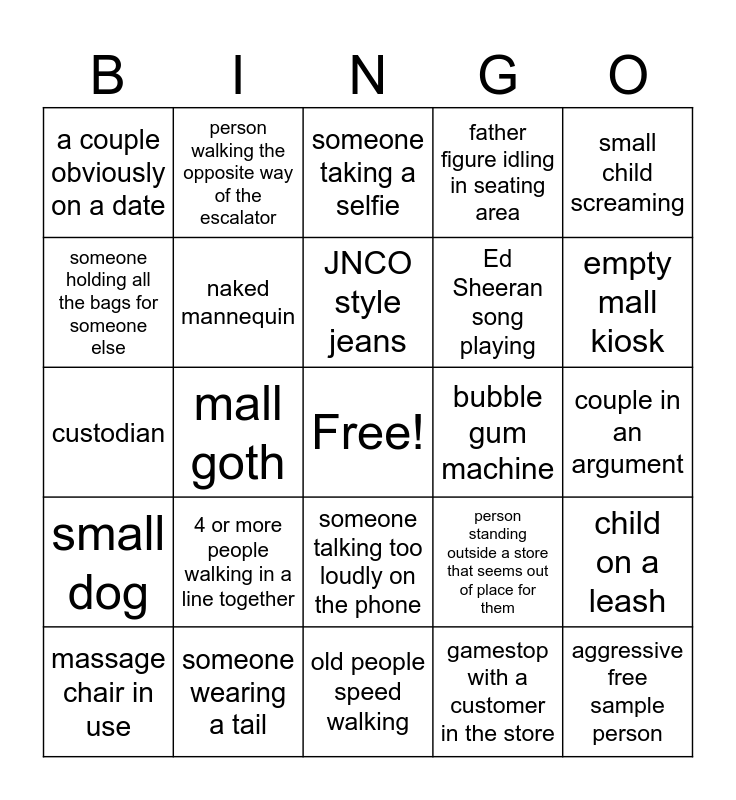 This bingo card has a free space and 24 words: 4 or more people walking in a line together, someone wearing a tail, JNCO style jeans, massage chair in use, small child screaming, a couple obviously on a date, someone holding all the bags for someone else, person walking the opposite way of the escalator, bubble gum machine, someone talking too loudly on the phone, Ed Sheeran song playing, custodian, person standing outside a store that seems out of place for them, child on a leash, naked mannequin, gamestop with a customer in the store, couple in an argument, someone taking a selfie, empty mall kiosk, mall goth, aggressive free sample person, small dog, father figure idling in seating area and old people speed walking.