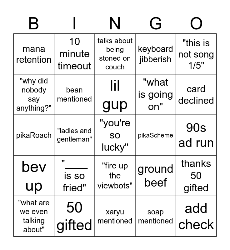 This bingo card has 25 words: "____ is so fried", xaryu mentioned, lil gup, "what are we even talking about", "this is not song 1/5", mana retention, "why did nobody say anything?", 10 minute timeout, pikaScheme, "fire up the viewbots", "what is going on", pikaRoach, ground beef, thanks 50 gifted, bean mentioned, add check, 90s ad run, talks about being stoned on couch, card declined, "ladies and gentleman", "you're so lucky", 50 gifted, bev up, keyboard jibberish and soap mentioned.